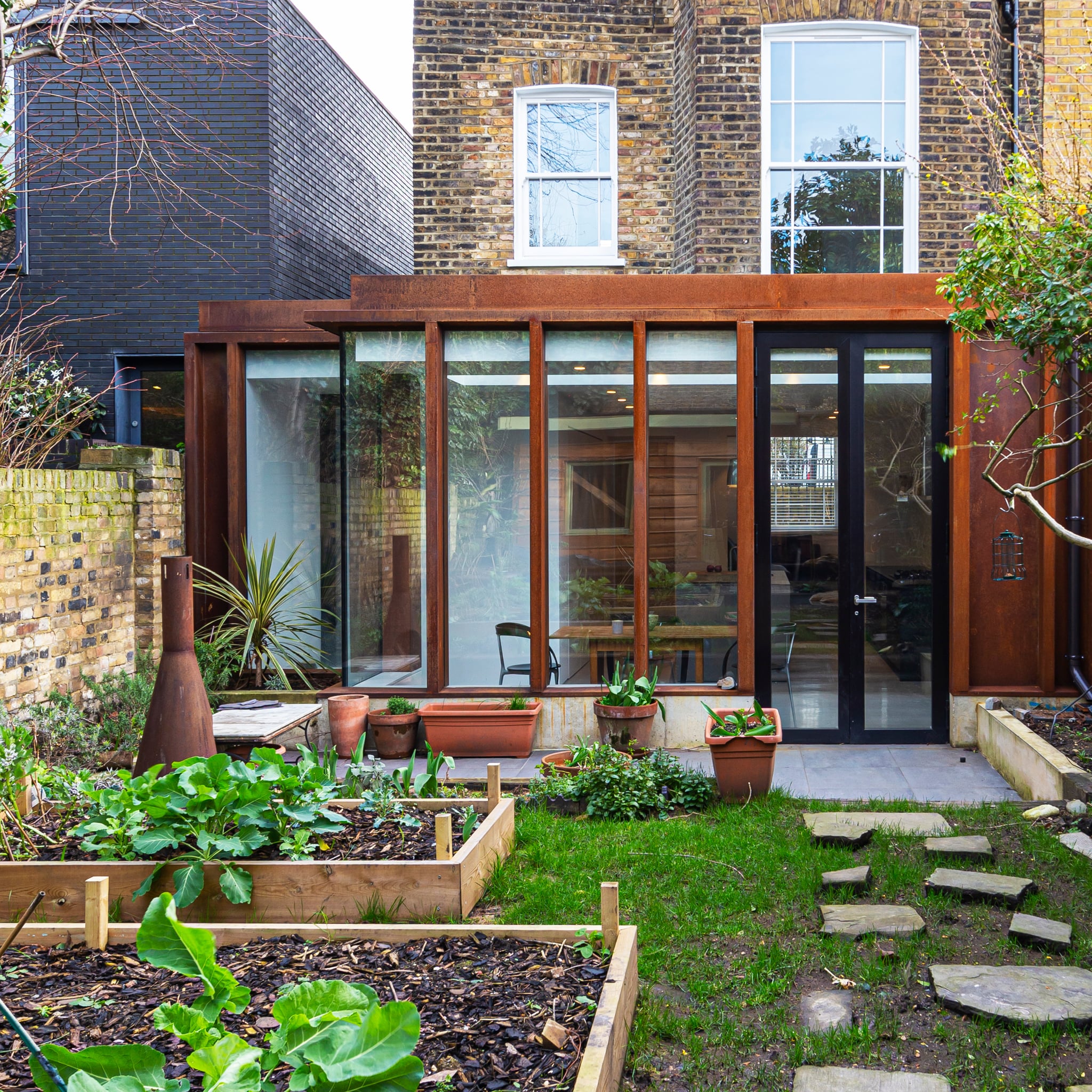 Care was taken to ensure the extension had a strong connection with the existing garden. The extension features full height glazing to reinforce the relationship with the garden and the extension was clad in corten steel to complement greenery of the client’s allotment garden as well as the existing brickwork of the house.